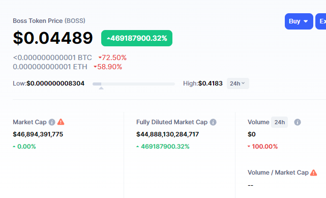 There has been an hourly dip by -155. It has a circulating supply of 0 BOSS coins and a max supply of 100000000000000000 BOSS coins. BOSS price today is 0 with a 24-hour trading volume of 0.